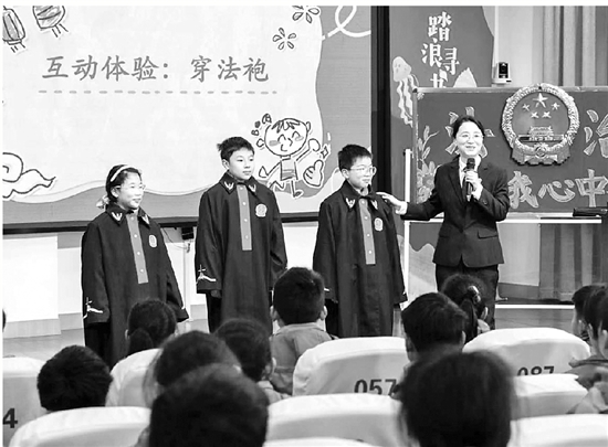 近日,舟山市中级人民法院干警走进当地小学,以法治小课堂的形式,讲解未成年人保护相关法律知识,为学生送上干货满满的“开学第一课”。图为学生与法院干警互动,体验穿法袍。 通讯员 陈晓迪 本报记者 陈毅人