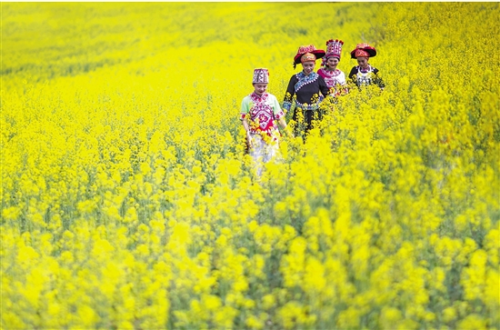 3月8日,人们在云南省文山壮族苗族自治州砚山县阿猛镇下科木村油菜花田游玩。