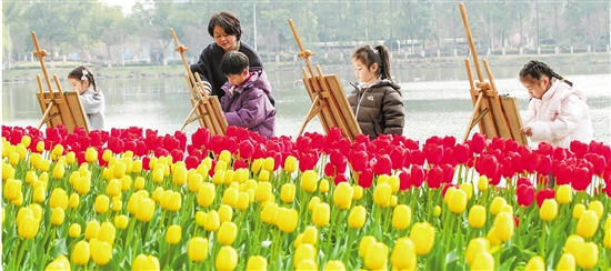 3月9日,德清县武康街道春晖公园的郁金香进入盛花期,德清县第二实验幼儿园将绘画课搬到公园里,让学生以“春天”为主题,用手中画笔描绘美丽春色。