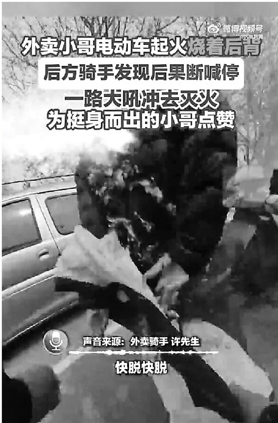 近日,山东淄博,外卖小哥电动车起火烧着后背,后方骑手许先生发现后果断喊停,一路大吼冲去灭火。由于发现及时,起火外卖小哥后背被烫起水泡,未造成严重后果,许先生也因帮忙救火烧伤手背。