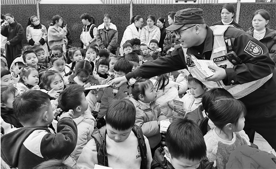 近日,临海市公安局小芝派出所民辅警走进辖区幼儿园,开展安全“童”行宣传活动,通过互动问答、发放宣传手册等形式,向孩子们普及过马路走斑马线、识别信号灯等交通安全常识,筑牢校园安全防线。