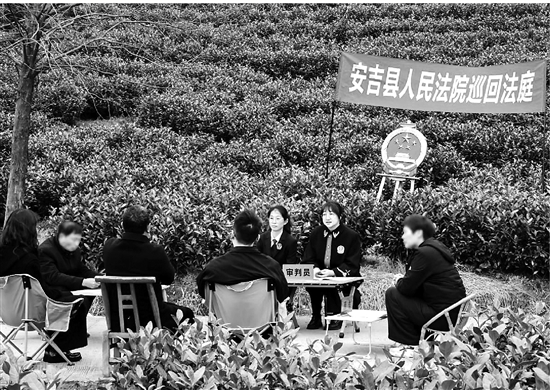 近日,茶山绿意渐浓,安吉县人民法院法官背靠茶山,巡回审判一起涉茶委托合同纠纷。