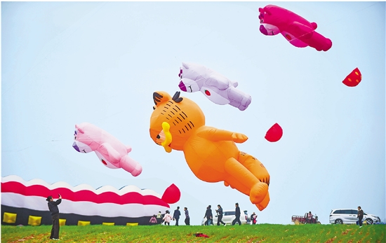 3月21日,人们在河南省洛阳市新安县南李村镇乡村风筝嘉年华活动现场欣赏造型各异的风筝。