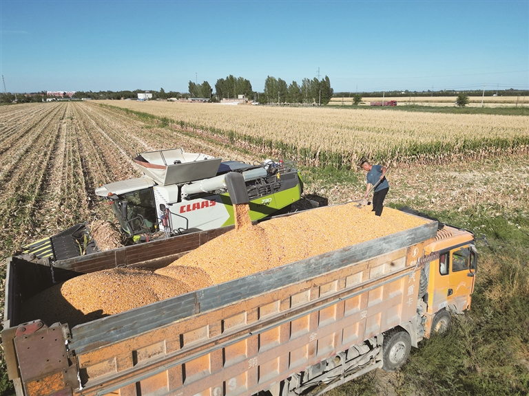 近日,吉木萨尔县庆阳湖乡3.3万亩商品玉米迎来丰收季。玉米收割机来回穿梭,一排排商品玉米被吞入收割机“腹”中,随后吐出金黄的玉米粒。 □叶永芳摄