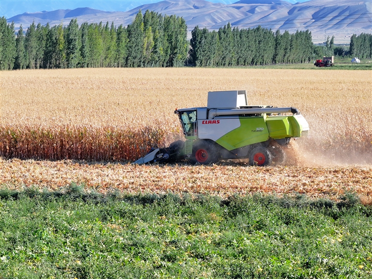 ?9月11日,在吉木萨尔县老台乡老湖村,大型收割机正在收获玉米。 □冯晓阳摄
