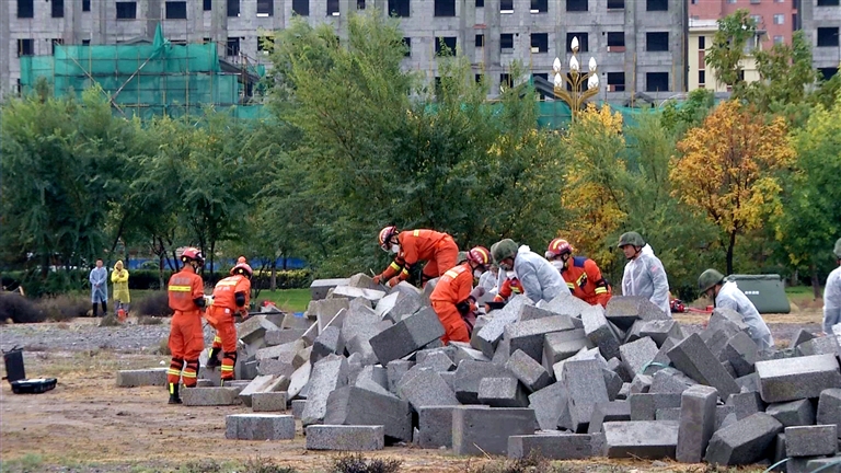 抗震救灾实战综合演练中,救援队伍在搜救被困人员。□苟彩霞摄