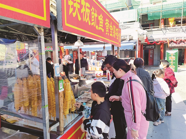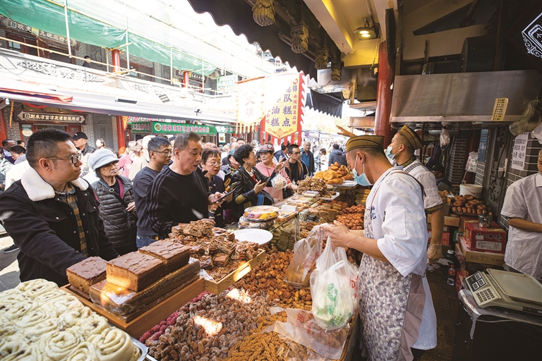 10月3日,昌吉小吃街,游客排队购买特色糕点。国庆期间,昌吉州通过开展各类特色活动,让更多游客看昌吉美景、品昌吉美食。□本报记者 巨海成摄