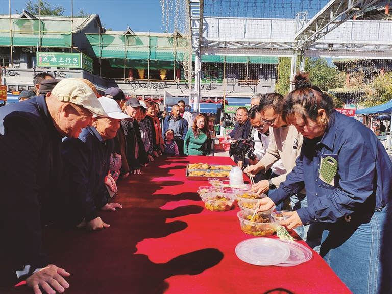 活动首日,在木垒县展示摊位上,游客免费品尝木垒特色美食。 □本报记者 荷苒·马汗摄