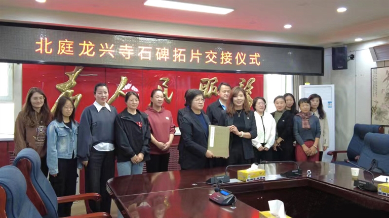 9月23日,旅顺博物馆工作人员将拓印的16件唐代北庭龙兴寺碑刻拓片,移交给吉木萨尔县丝绸之路北庭故城遗址博物馆。图为拓片交接仪式现场。□王统林摄