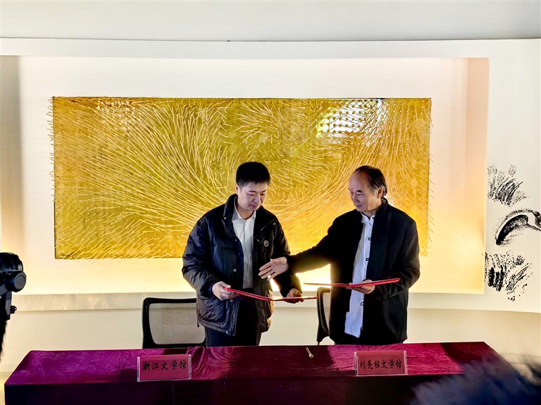 当日,刘亮程文学馆与浙江文学馆签署文学馆共建协议,建立两馆文学工作长期合作机制,确立长期长效共建关系。