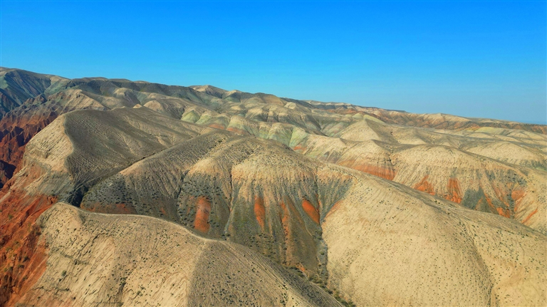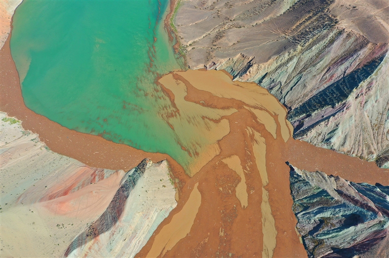 本报讯 通讯员刘华、姚金平、王惠报道:一场大雨,让昌吉市努尔加大峡谷呈现多样地貌,绚丽多彩。雨后的努尔加大峡谷碧空如洗,涓涓溪流汇聚成河,把河谷装扮得宛如一幅水粉画。裸露的沙石滩看似“枝干”,流水如“毛细血管”,延伸到“枝头”,一棵形神兼备的“大树”就呈现出来,惟妙惟肖。红色沙泥被流水冲刷,如藤蔓枝叶,交相辉映。从高处俯瞰,河水自南向北入湖,南边呈黄褐色,北边呈青绿色,在交汇处浊清分明,呈现“泾渭分明”的场景,堪称奇观,巧夺天工。丹霞多姿、奇峰异石、色彩斑斓,掩映一湾碧水,沟壑纵横,山峦锦绣,绵延到远方,徒增磅礴之势。