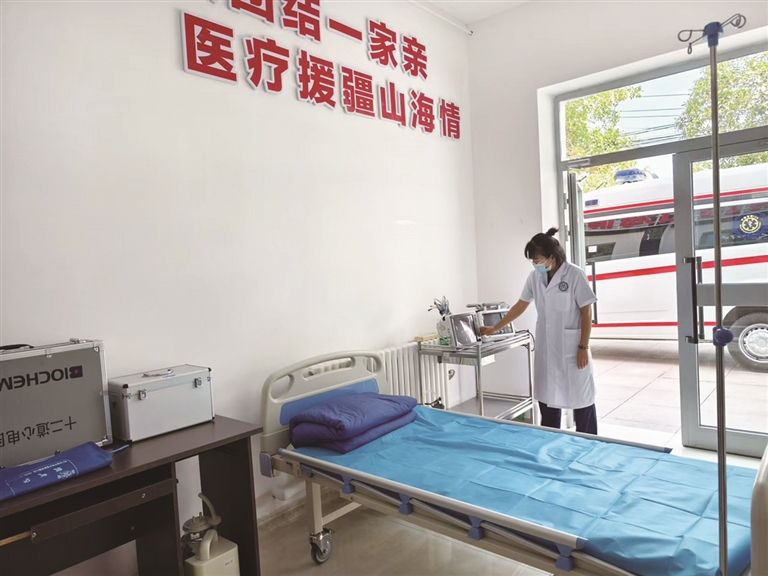 近日,玛纳斯县乐土驿镇卫生院急救站点,工作人员正在检查急救设备。 □本报记者 阿依加玛丽·列提甫摄