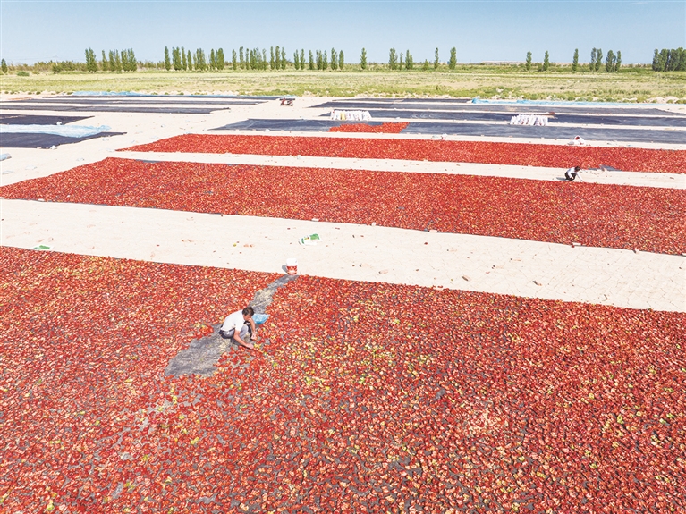 9月23日,吉木萨尔县北庭镇东二畦村,农户正在晾晒辣皮子。今年,北庭镇依托土地、气候等资源优势,积极发挥合作社的示范带动和桥梁纽带作用,采取“公司+合作社+农户”的模式,发展订单辣椒产业,种植面积达到560多亩。合作社积极做好全程技术指导,与种植户签订保价回收合同,最大限度降低农户种植风险,保障农户收益。□本报记者 巨海成摄