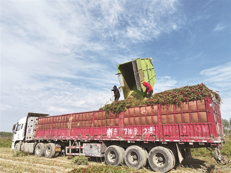 9月24日,在阜康市九运街镇七运湖村种植户许岗家的辣椒地,采收机和运输车配合默契采收色素辣椒。今年,阜康市九运街镇种植了450亩色素辣椒,预计每亩产量在700公斤至800公斤,每公斤价格在10元左右。□卢浩楠摄