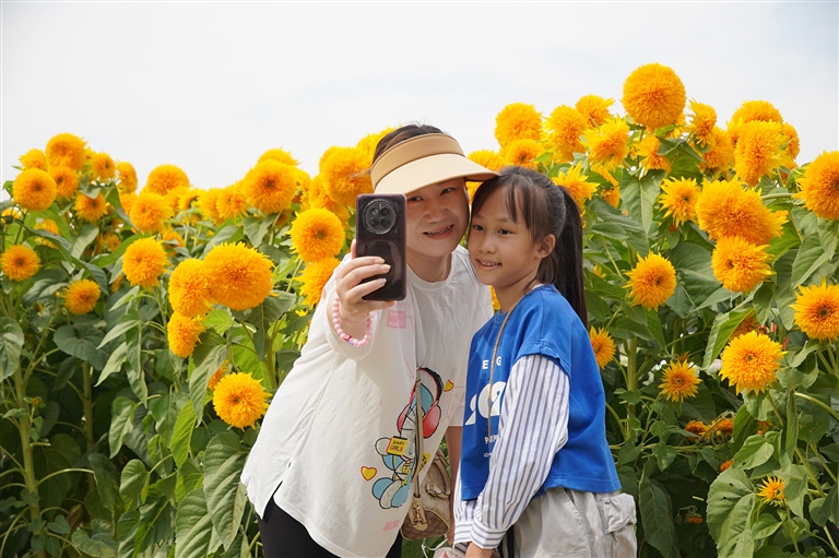 国庆期间,新疆农业博览园迎来旅游高峰。今年,新疆农业博览园种植菊花、观赏向日葵等100余万株,展示菊花品种1018种,并以菊花展为载体,开展了丰富多彩的“文旅+”活动。图为游客在观赏向日葵前拍照。 □张军剑摄