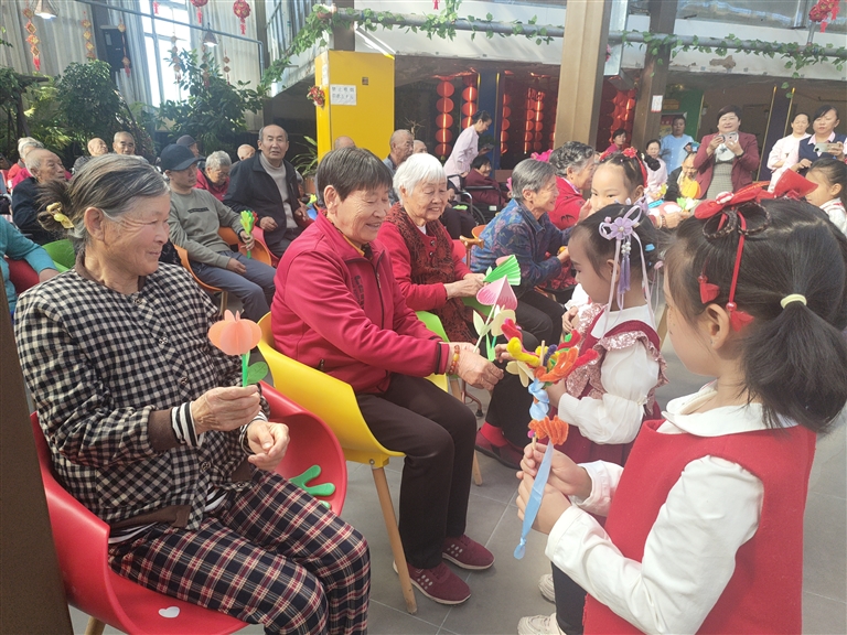 为弘扬中华民族尊老、敬老、爱老的传统美德,十月十日,玛纳斯县玛纳斯镇第四中心幼儿园的老师通过讲故事的形式,向孩子们介绍了重阳节的由来和习俗,让他们懂得关爱老人、尊敬长辈。图为孩子们向老人送手工制品。□朱 艳摄