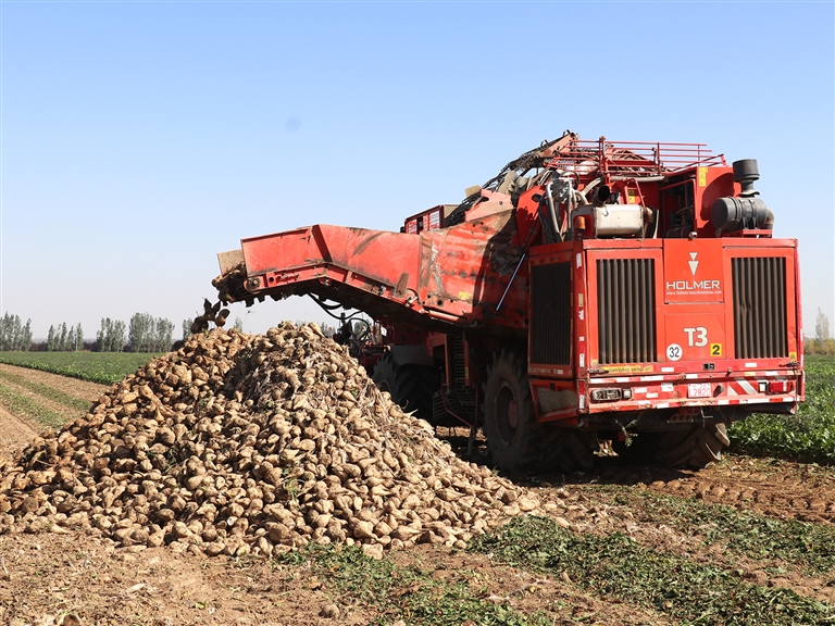 金秋时节,呼图壁县3155亩甜菜丰收,种植户迅速展开机械化采收作业,田间地头一派繁忙的丰收景象。图为10月1日,在呼图壁县二十里店镇宁州户村的甜菜地里,甜菜收割机正在收割作业。 □宋凯琪摄