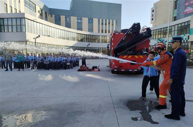 在消防装备展示区,学生试穿了消防战斗服和抢险救援服,还体验了乘坐消防车、试戴空气呼吸器、使用消防水枪等。通过参与体验活动,学生近距离接触各类消防器材,学习消防安全知识,过足了“消防瘾”。