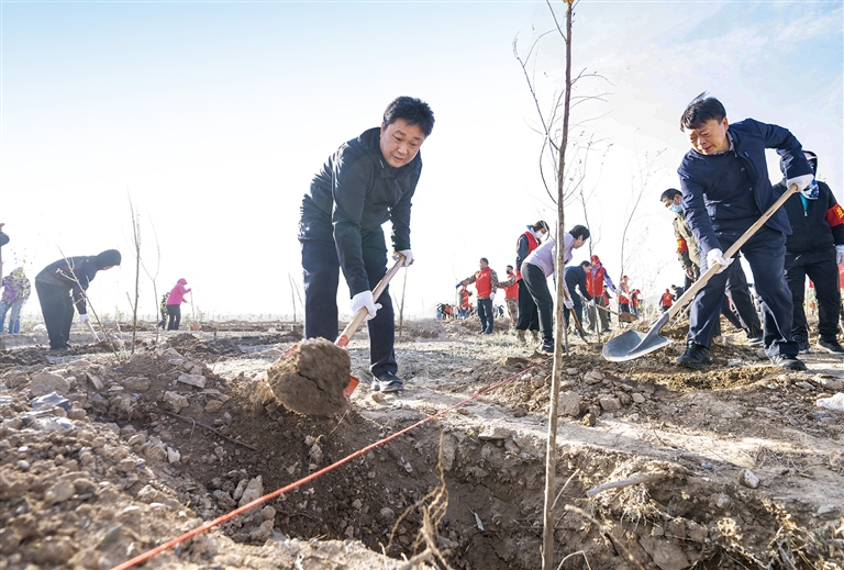 植树现场,秋日暖阳照耀,大家干劲十足。曾艳阳等昌吉州领导拿起铁锹走进植树点,挥锹铲土、培土围堰、提水浇灌,合力栽下一棵棵沙枣、胡杨等树苗。曾艳阳一边植树,一边询问土壤墒情、树木生长周期、苗木灌溉等情况,叮嘱有关部门要加强苗木管护,努力提高苗木成活率,确保栽一处苗木、成一片绿意、美一方天地。
