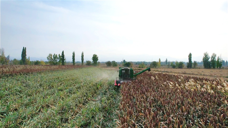 10月15日,阜康市滋泥泉子镇中沟中心村,一台收割机正在收获高粱。 □孟跨越摄