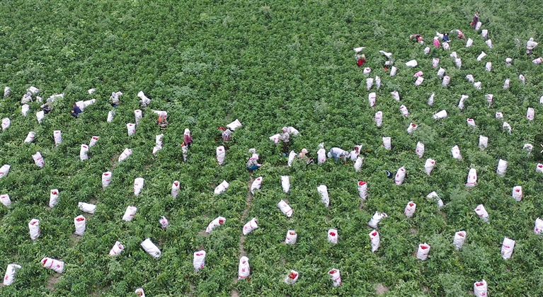近日,吉木萨尔县北庭镇680亩辣椒迎来丰收,种植户们抢抓时节进行采收,田间地头一派忙碌景象。 □张 锐摄
