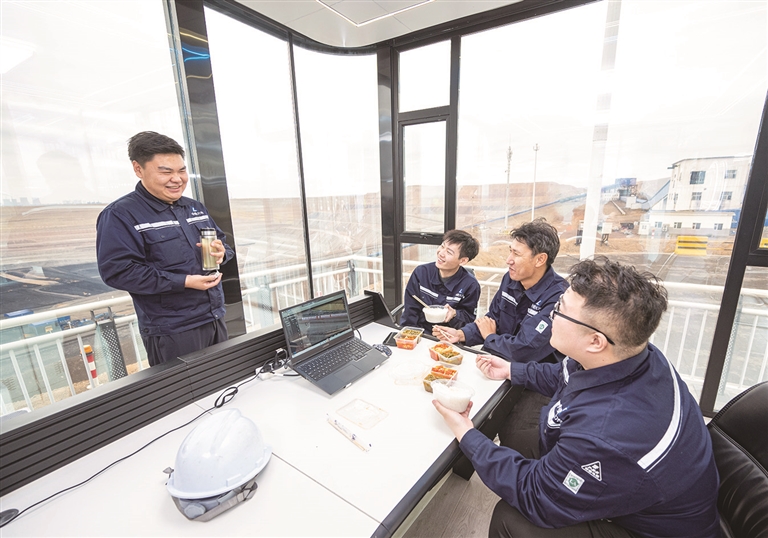 10月18日,国家能源集团新疆能源有限责任公司准东露天煤矿智能云控中心,班组人员在一起吃饭。