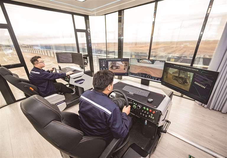 10月18日,国家能源集团新疆能源有限责任公司准东露天煤矿智能云控中心,操作员在远程操作无人矿卡。