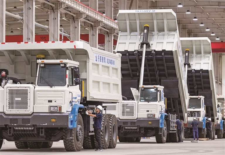 在位于准东经济技术开发区的新疆行路智驾新能源科技有限公司车间内,工人正在组装无人矿卡的零配件。该企业看好当地市场发展前景,2023年7月落户准东经济技术开发区,主要业务有无人驾驶技术研发推广,生产销售无人矿用高端装备等,达产后可实现年产500辆新能源矿卡。该企业生产的无人矿卡采用甲醇燃料,比纯柴油矿卡节能30%至35%,准东经济技术开发区有很多化工企业,甲醇燃料能够就近采购,节能且环保。