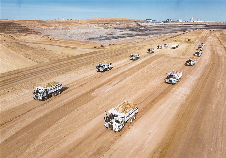 10月16日,国家能源集团新疆能源有限责任公司准东露天煤矿内,500多辆工程车辆正有序作业,其中由113台无人矿卡组成的运输队格外显眼,它们每天24小时运行,可将10万吨剥离的土方运到排土场。