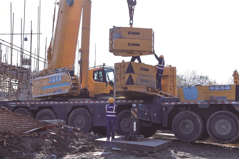 10月21日,呼图壁县大丰镇供水保障(二期)工程项目建设现场,工人正在吊装施工。□朱含雪摄