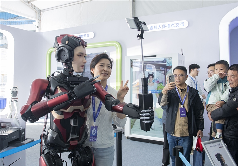 10月24日,在第七届世界声博会上,一款人形交互机器人持自拍杆与观众合影。当日,第七届世界声博会暨2024科大讯飞全球1024开发者节在合肥开幕。本届声博会同期举办人工智能产品创新展,设置科技馆、工业馆、教育馆、生活馆等8个主题展馆。 □新华社记者 傅 天摄