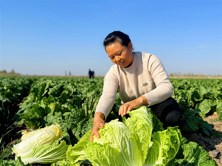 10月22日,昌吉市佃坝镇西沟村,种植户戴德英在察看自家的大白菜。 □刘 华摄