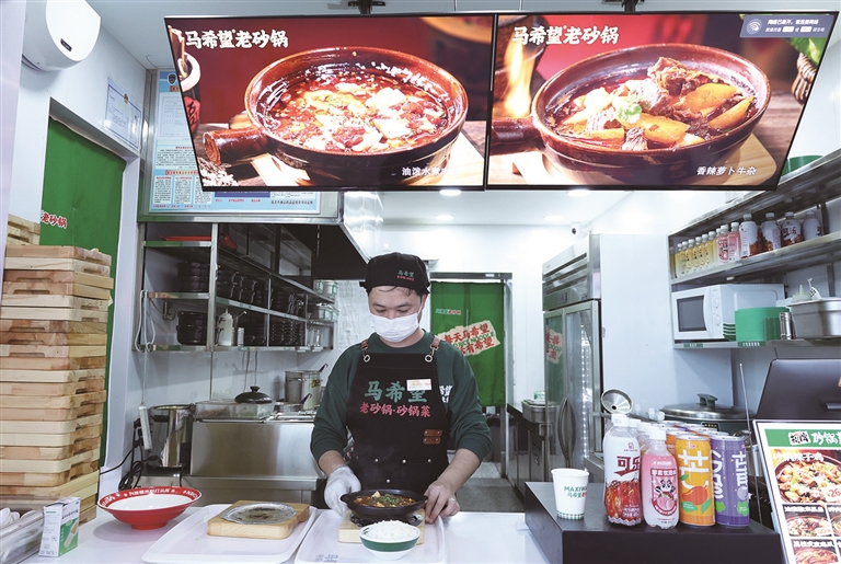 10月21日,昌吉市马希望老砂锅东方广场店,店员为顾客制作砂锅。 □本报记者 付小芳摄
