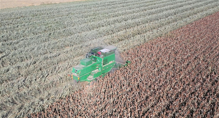 ?近日,在吉木萨尔县吉木萨尔镇校场湖村马斌家的高粱地里,农机手正驾驶收割机采收高粱。□张 锐摄