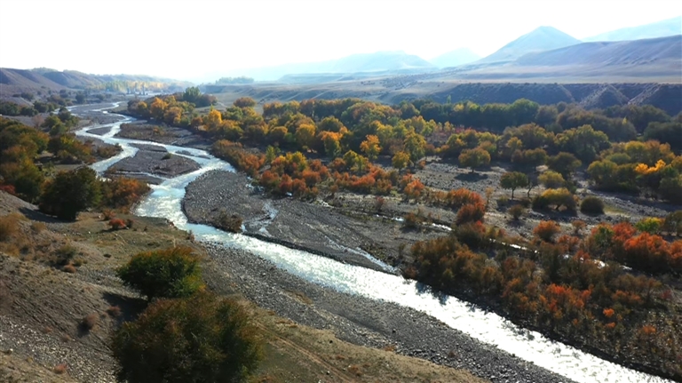 ?金秋时节,玛纳斯县塔西河流域清澈的河水从石门子水库奔流而下,保障了下游树木健康生长。□瓦力斯江·乌马尔江摄