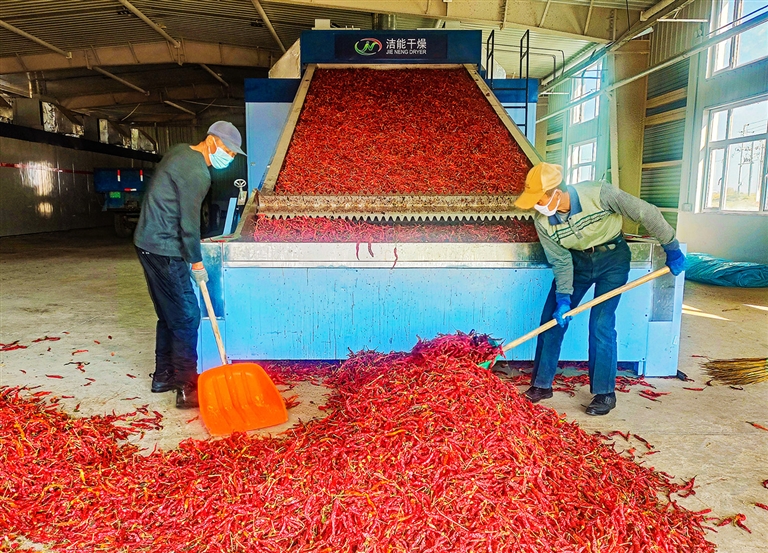 10月26日,吉木萨尔县北庭镇泉水地村辣椒烘干车间,村民将线椒铲至烘干机上。该镇种植大户及村经济合作社种植订单辣椒600余亩,产量达2000多吨。同时,建设了泉水地村辣椒分拣包装车间,做大辣椒产业。 □钟丽萍摄