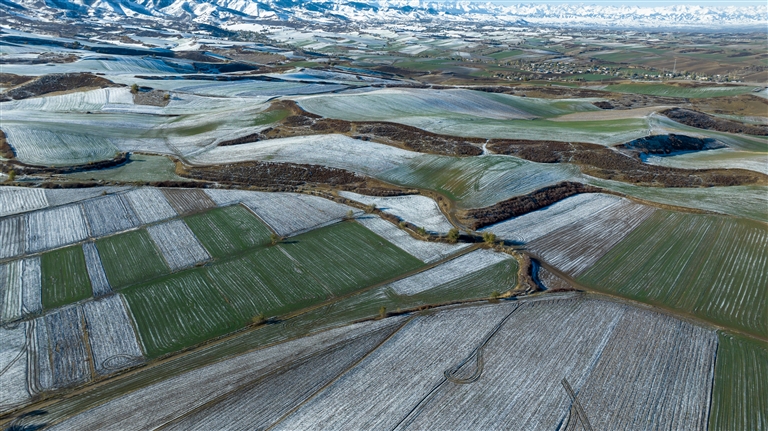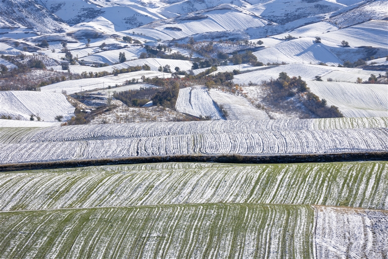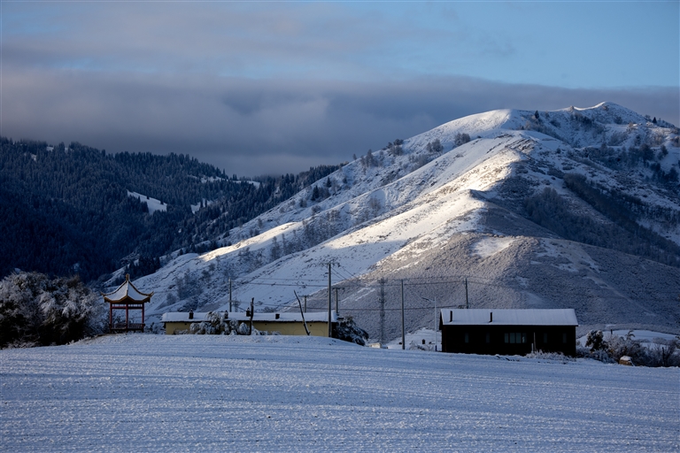 近日,在木垒县南部山区,一场秋雪不期而至,人们看到了秋雪与大地交融的奇妙景观。在东城镇沈家沟村,倏忽之间,大地便完成由秋入冬的交接,无垠的大地像是被打翻了的调色盘,万亩旱田一夜之间披上了银装,宛如一幅山水泼墨画,清新素雅,恬淡静谧。