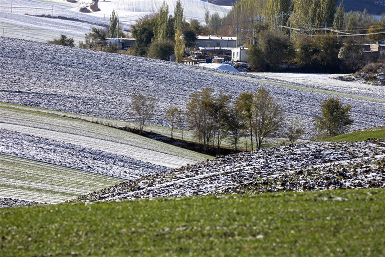 昨日还是金秋时节,今天已是瑞雪纷飞,经过初雪洗礼后的村舍田园,斑斓色彩点缀其中的雪野悄悄替换了夏日的浓郁绿意,群山、绿野、白雪,融为一体,雪白与秋黄交错,淡墨相宜,更是为秋色增添了不少神秘柔情。