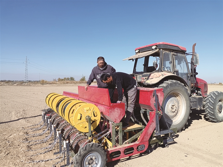 小麦传统种植过程中,一亩地用种量平均二十七八公斤,多的高达30公斤,浪费太多。依据自己的投种量算法,周李强带领团队尝试播种从17公斤、15公斤、13公斤、12公斤直到9公斤的小麦种子,发现产量变化不大,但省了很多种子。惊喜的发现让周李强激动不已。随后,他和团队马不停蹄开始和新疆农垦科学院的小麦团队合作,走上科研创新之路。与此同时,研发配套的播种机也在进行中。小麦种植密度高,亩穴数与棉花接近,他们便又在棉花穴播机的基础上不断改造,实现精准播种。2018年底,第一台小麦精准播种机诞生了。