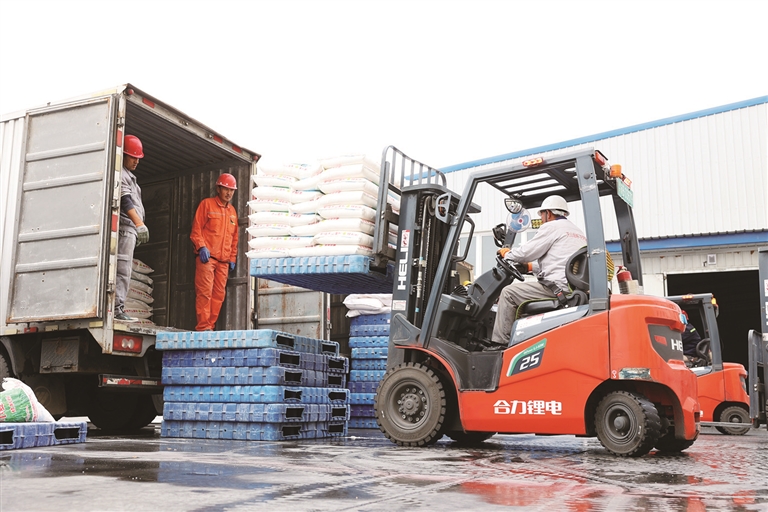 10月29日,新疆天山面粉(集团)有限责任公司的工人在厂区内用叉车装载面粉。 该公司依托天然优质小麦资源,在传承发展中实现新的突破,目前拥有小麦粉、馒头粉、饺子粉、雪花粉等10余个品种50多种规格的产品,畅销疆内外。 □梁宏涛摄