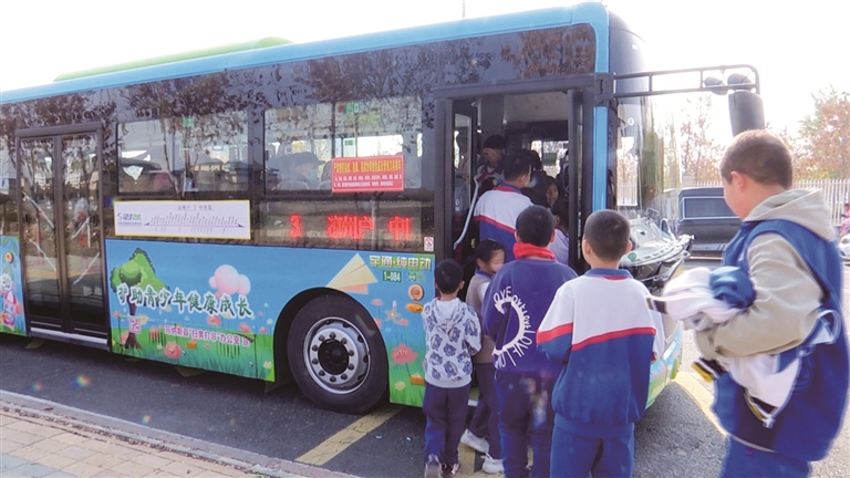 10月22日,玛纳斯县的学生正在排队乘坐“护苗”主题公交车。□丁慧琴摄