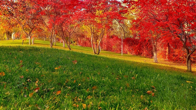 昌吉市人民公园里,同样是一片斑斓秋色。市民在这里散步、健身、拍照,享受着秋日的美好时光。公园里的树木种类繁多,有枫树、银杏树、梧桐树等,它们以不同的姿态展示着秋天的魅力。