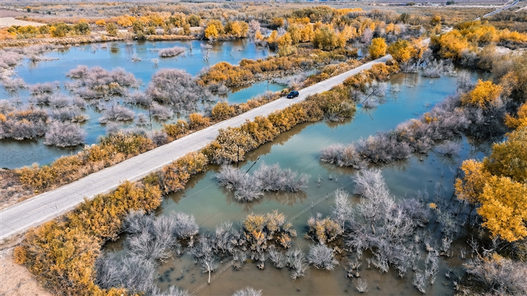 金秋时节,呼图壁县园户村镇文昌村的胡杨林披上金装。 □马光元摄