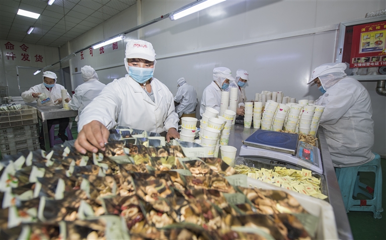 10月28日,位于昌吉国家农业高新技术产业示范区的新疆雪山果园食品有限公司坚果车间里,工作人员正在装填坚果。□本报记者 何 龙摄