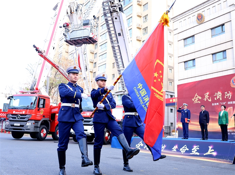 ?11月6日,昌吉州“119”消防宣传月活动启动仪式暨车辆装备配发活动现场,全体人员迎消防救援队旗。 □本报记者 付小芳摄