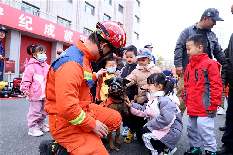 11月6日,昌吉州消防救援支队院内,小朋友在消防救援人员的陪伴下与搜救犬互动。□本报记者 付小芳摄