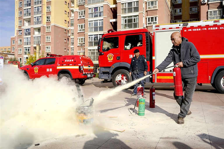 11月9日,昌吉市嘉禾欣居小区,居民学习使用灭火器。□洪文乐摄
