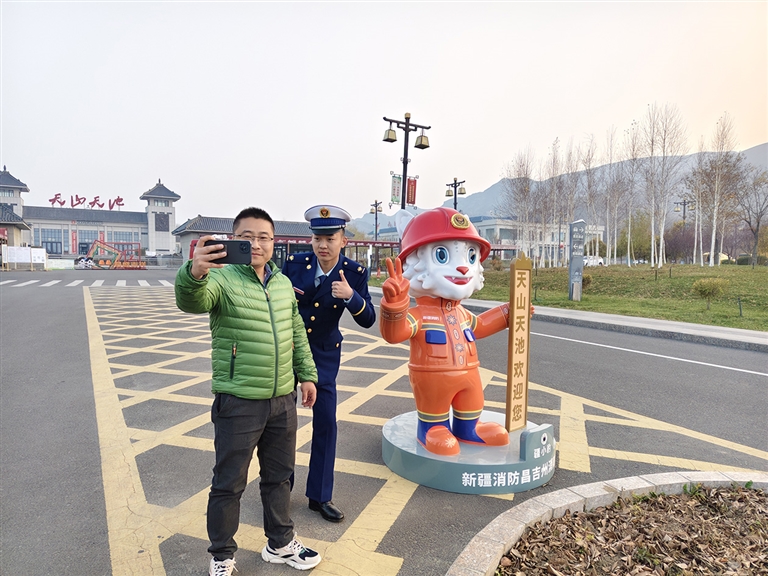 11月4日,阜康市消防救援大队在天山天池景区开展消防安全宣传活动。图为游客在景区的消防IP“疆小豹”形象打卡处合影留念。□刘 臣摄