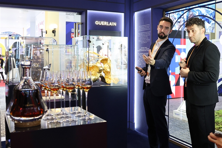 11月5日在法国馆拍摄的艺术品和酒。 11月5日至10日,第七届中国国际进口博览会在上海举办。本届进博会国家展继续为各国展示综合形象和贸易投资领域机遇搭建重要平台,有77个国家和国际组织参展。法国、马来西亚、尼加拉瓜、沙特阿拉伯、坦桑尼亚、乌兹别克斯坦担任主宾国。□新华社记者 殷 刚摄
