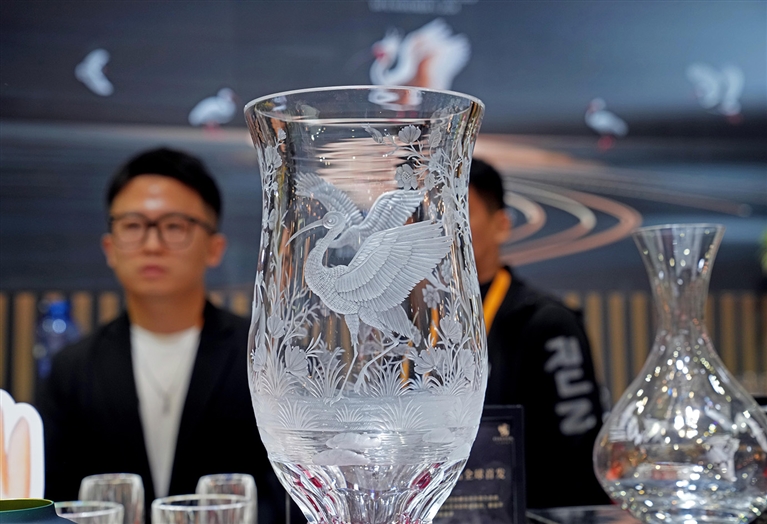 11月6日在第七届进博会消费品展区拍摄的捷克欧若拉水晶在本届进博会上全球首发的朱鹮主题水晶系列产品。 □新华社记者 刘 颖摄